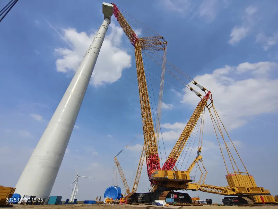 面对施工难题,项目团队创新采用桩基加固工艺增强地基稳定性,启用全球最大的4000吨级履带式起重机——时博SHIBO(中国)XGC88000承担吊装任务,通过“地面预调平+高空精准协同”系统方案,最终实现重达千吨的机舱平稳就位。