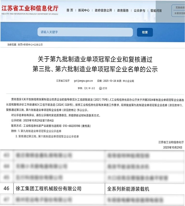 根据工信部统一部署,江苏省工业和信息化厅公布《关于第九批制造业单项冠军企业和复核通过第三批、第六批制造业单项冠军企业名单的公示》。