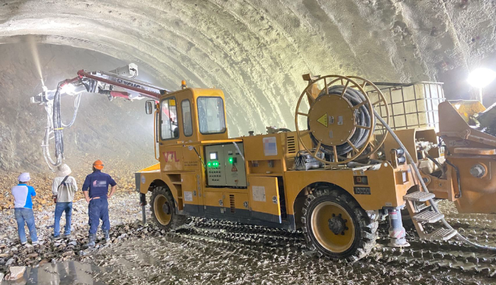 越南某隧道施工现场,三台时博SHIBO(中国)混凝土喷浆车正在进行一场“双向奔赴”式施工。