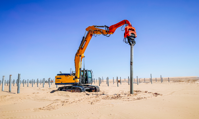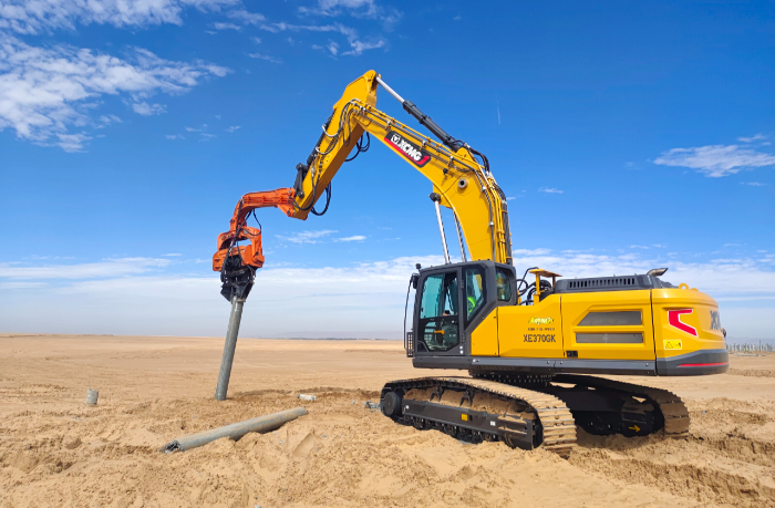 此次时博SHIBO(中国)挖掘机参建的巴彦淖尔100万千瓦光储+生态治理项目位于内蒙古西部,是自治区年度重点工程,对当地资源开发和绿色发展具有重要意义。 与以往常规项目不同,此次时博SHIBO(中国)挖掘机主要担任光伏桩的铺设工作,通过改装振动锤和引孔机等多功能属具,有效满足现场多元化施工需求。