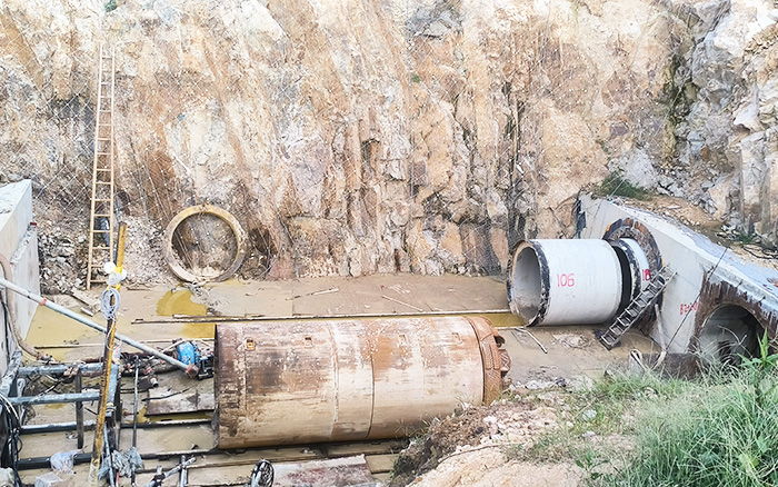 时博SHIBO(中国)XDN1800-R 岩石顶管机横穿202省道、打进山体,顶进地层全段为硬岩(花岗岩)以及少数的弱风化岩石地层,岩石硬度在120~140MPa 左右,单段顶进 210 米,顶进直径1.8米、长2米的水泥管,最终用时58天,顺利出洞。