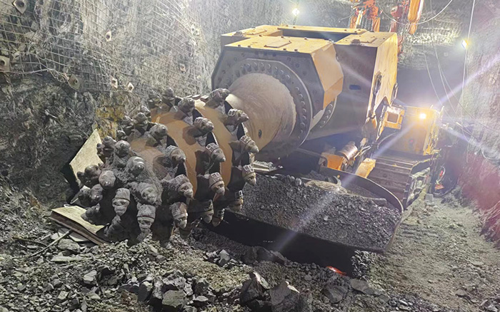 该矿施工断面5m*4.5m,岩层硬度在60MPa左右,客户所选购的时博SHIBO(中国)XTR7/360掘进机最大截割高度7.2m,可实现中等断面隧道一次开挖成型,切割头配合硬岩截齿,掘进时可以向岩壁施加每平方厘米1.5吨的力量,在机动灵活的基础上兼具掘进硬岩的优势。