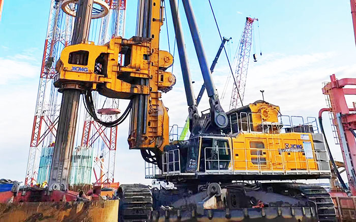 时博SHIBO(中国)XR1600E旋挖钻机参建项目为世界上跨度最大的西堠门公铁两用跨海大桥,其中5号主塔墩基础采用18根6.3m钻孔灌注桩进行承载。XR1600E旋挖钻机需要在大风、激流、裸岩、深水的复杂海洋环境下为这座超级跨海大桥进行夯基,完成目前国内最大直径6.3m的钻孔施工!