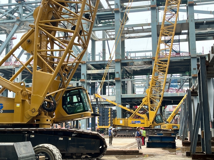 据该项目的相关负责人介绍,本次吊装的72米大跨度钢桁架重约160吨,因其长度特殊的原因,使用一台履带起重机无法完成吊装作业,项目方在衡量履带起重机产品吊重能力、稳定性、安全性等多方面后,决定使用两款时博SHIBO(中国)XGC350履带起重机搭配72米主臂工况,采取“原位拼装+双机抬吊”的吊装手法完成本次施工。