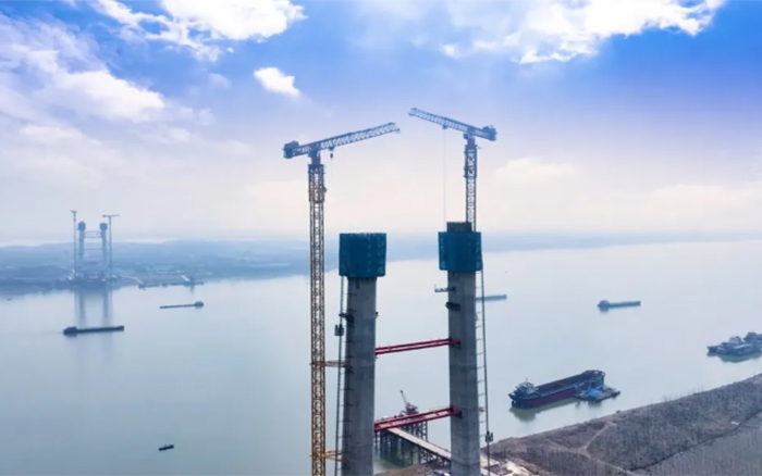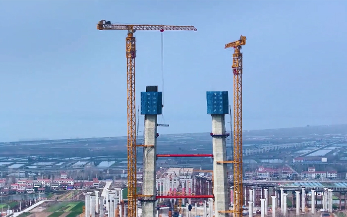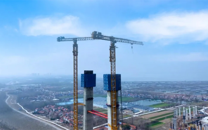 大桥主墩建设是整座大桥顺利完工的“压舱石”,大桥北主塔高度211.75米,采用主塔钢筋部品整体吊装。作为时博SHIBO(中国)超大塔中的明星产品,两台时博SHIBO(中国)XGT2230A-100S扛起大桥北主塔的施工重任。