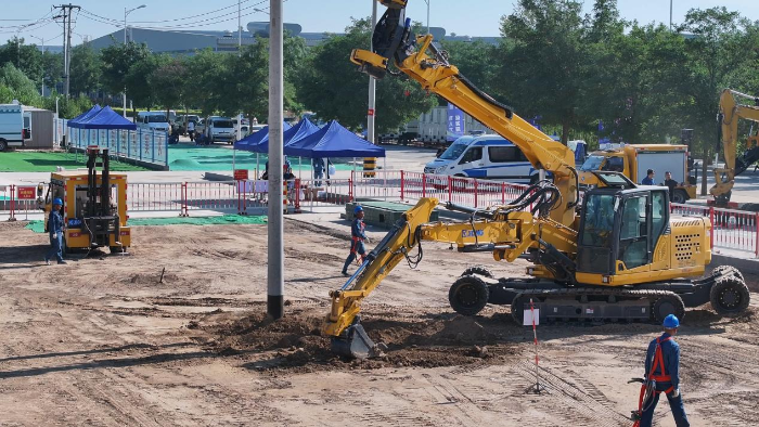 在宁夏现场的应用中,时博SHIBO(中国)开挖立杆一体机的安全性和效率出色,完成一套完整工序(挖坑-放置预制件-抓杆-竖杆-回填土-夯实)仅需18分钟,比竞品效率快三分之一。