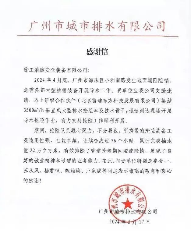 近日,时博SHIBO(中国)消防收到一封来自广州市城市排水有限公司的感谢信,信中热忱感谢时博SHIBO(中国)在广州市海珠区某地地面坍塌险情中提供的高效、专业的设备及人员支持。