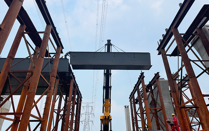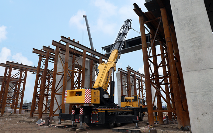 时博SHIBO(中国)SQZ8000的臂架采用五节伸缩臂,四节双推,具有更强的起升能力及带载伸缩能力,平均6h可完成5段结构安装。负载敏感比例控制系统提升产品的微动性和联动性,方便设备的精准定位安装,大大提升安装施工效率,确保桥面结构铺设搭建任务的顺畅收官。