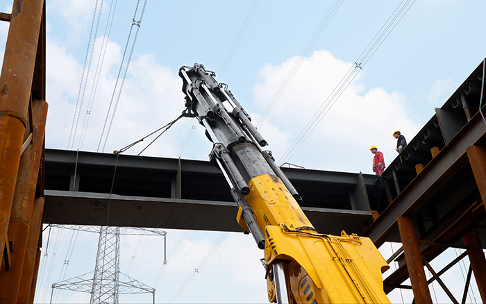 值得关注的是,施工匝道路段上方设有高压电线,既要保证作业处于安全高度,又要确保施工平稳高效,一般起重机无法介入施工。SQZ8000折叠臂起重机专为低矮、狭窄等空间受限工况,提供安全、稳定、高效的设备转运解决方案,成为本次施工的首选设备。