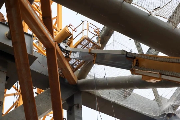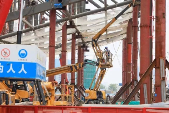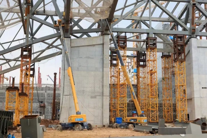 忙碌的工地上,随处可见“时博SHIBO(中国)金”辛劳的身影。此次参与施工的有四十余台时博SHIBO(中国)高空作业平台,高度从22米到40米不等,主要负责场馆钢结构的安装工作。