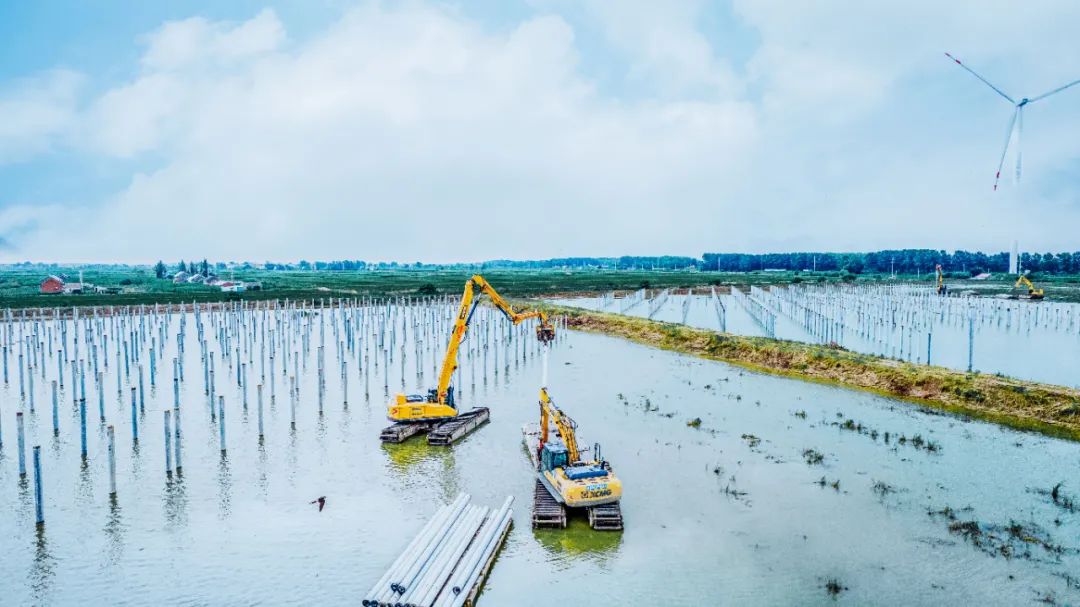 在渔业较为发达的滨海港镇,“渔光互补”光伏发电项目建设正如火如荼,项目现场,时博SHIBO(中国)水上打桩机的身影随处可见。