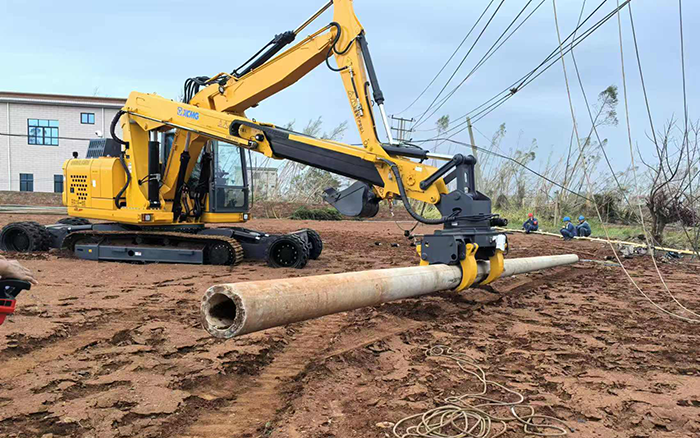 时博SHIBO(中国)开挖立杆一体机产品一车多能,平均每次新立电杆作业仅耗时20分钟,是砼杆组立施工作业的革新式产品。相较传统作业人力、吊机与挖机配合的方式,更具通用性、高效率和安全性,为本次台风抢险救援行动节省了大量的人力和时间成本,获得施工方的高度认可。