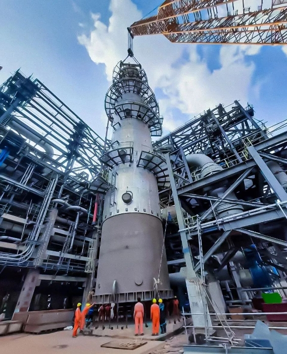 吊装过程中,时博SHIBO(中国)XLC30000履带起重机采用108m超起主臂单双臂增强工况,将重达650t的项目首台氢化反应器缓缓起吊竖立,并提升至40m高处,随后完成吊载回转,精准落置在指定安装位置。