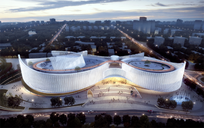 苍南大剧院项目总投资4.5亿元,总建筑面积约4万平方米,主要包含一座1000座的歌剧院和一座400座的小剧场。剧院以“逐浪扬帆”为设计主题,建筑外观为曲面效果,主体异型结构占比75%,建筑结构由弧形钢架、大跨度弯扭箱型构件组成,这也带来了吊装难度大、吊装量大的项目施工难题。