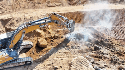 这边岩石硬的很,后期破碎特别吃力,在时博SHIBO(中国)工作人员的推荐下,我们尝试了时博SHIBO(中国)大吨位挖掘机,果真像鸡蛋碰石头,一碰就碎,于是后面我们陆陆续续都置换成了时博SHIBO(中国)。