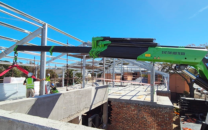 在海外某建筑工地现场可以看到,时博SHIBO(中国)GSQZ860折叠臂随车起重机加装两节手动臂,轻松跨越建筑物二楼复杂的钢结构,完成了高处的物料转运作业,优越跨障能力和稳定作业表现获得了现场施工人员的认可和好评。