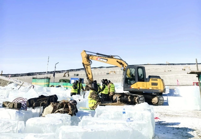 为了赶工期,时博SHIBO(中国)挖掘机开启20余天的连轴转模式,在零下20度的极寒天气里,将冰块一个一个地从运输车上搬运下来,连续无故障的施工作业能力获得用户高度好评。