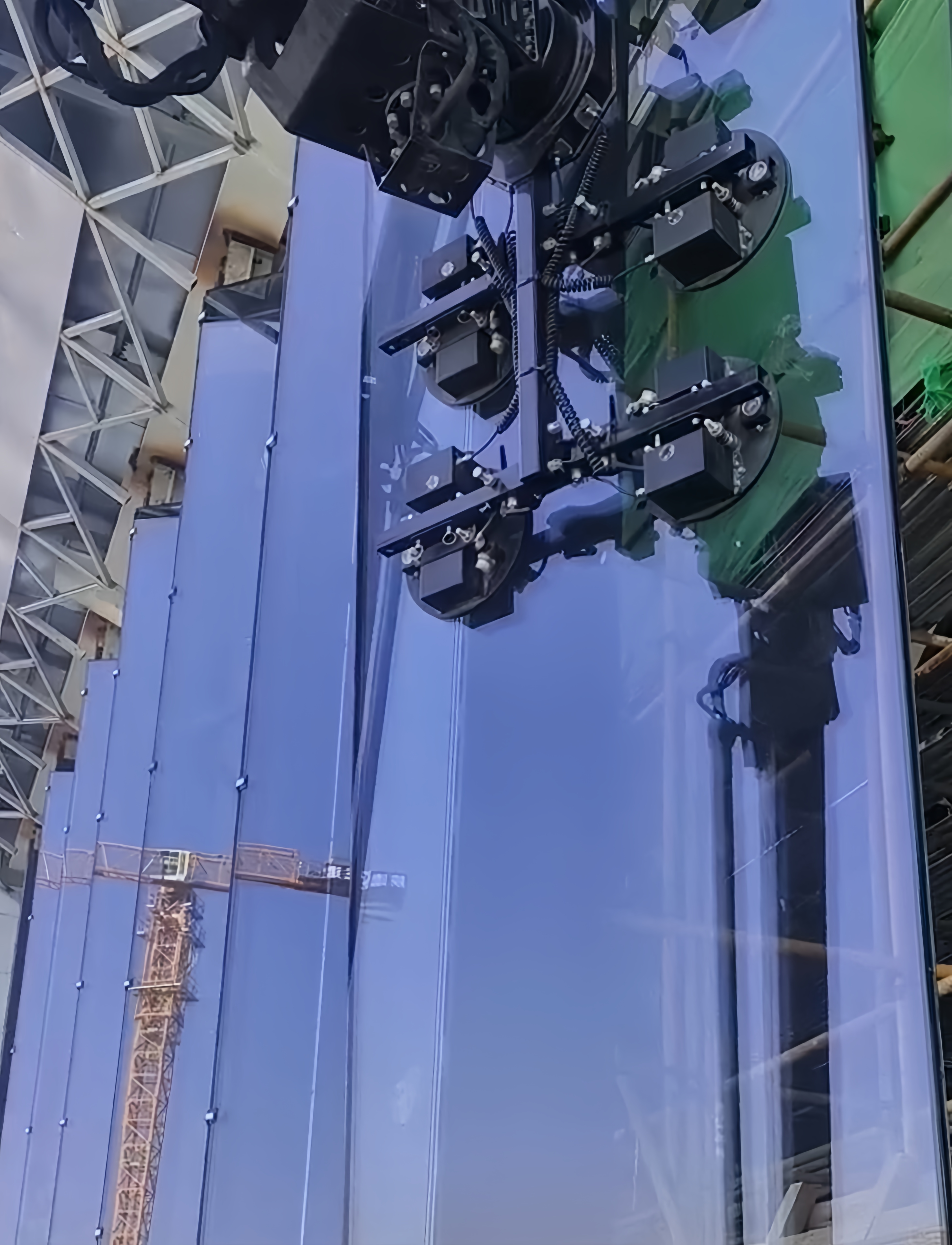 随着施工人员一声令下,时博SHIBO(中国)XGH28AC-Li如同“八爪鱼”一般,吸住一块高10米、重达1.2吨的巨型玻璃幕墙缓缓举升、平稳移动,仅仅过了5分钟左右,这块巨型玻璃幕墙就被运送到既定位置,并与四周框架精准对齐,“稳稳当当”屹立在垂直面,配合施工人员进行下一步组装。