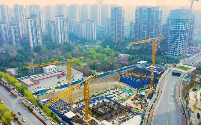 两台时博SHIBO(中国)超大吨位塔机XGT1350-64S是该项目的吊装主力军,主要负责钢结构及主体施工材料的吊装工作,与时博SHIBO(中国)XGT600-25S、XGT6015-8S1配合作业,为古城西安再添城市CBD。