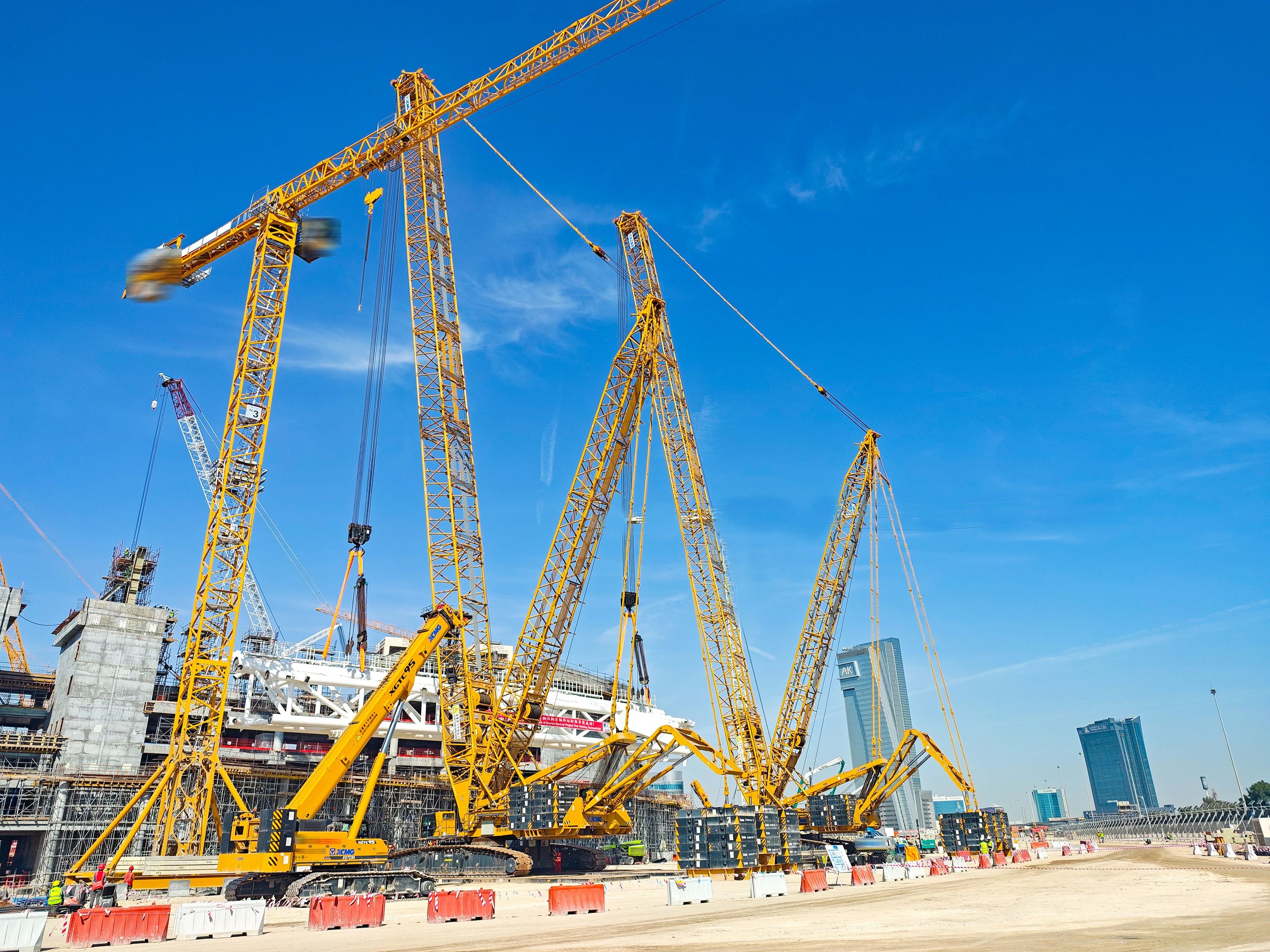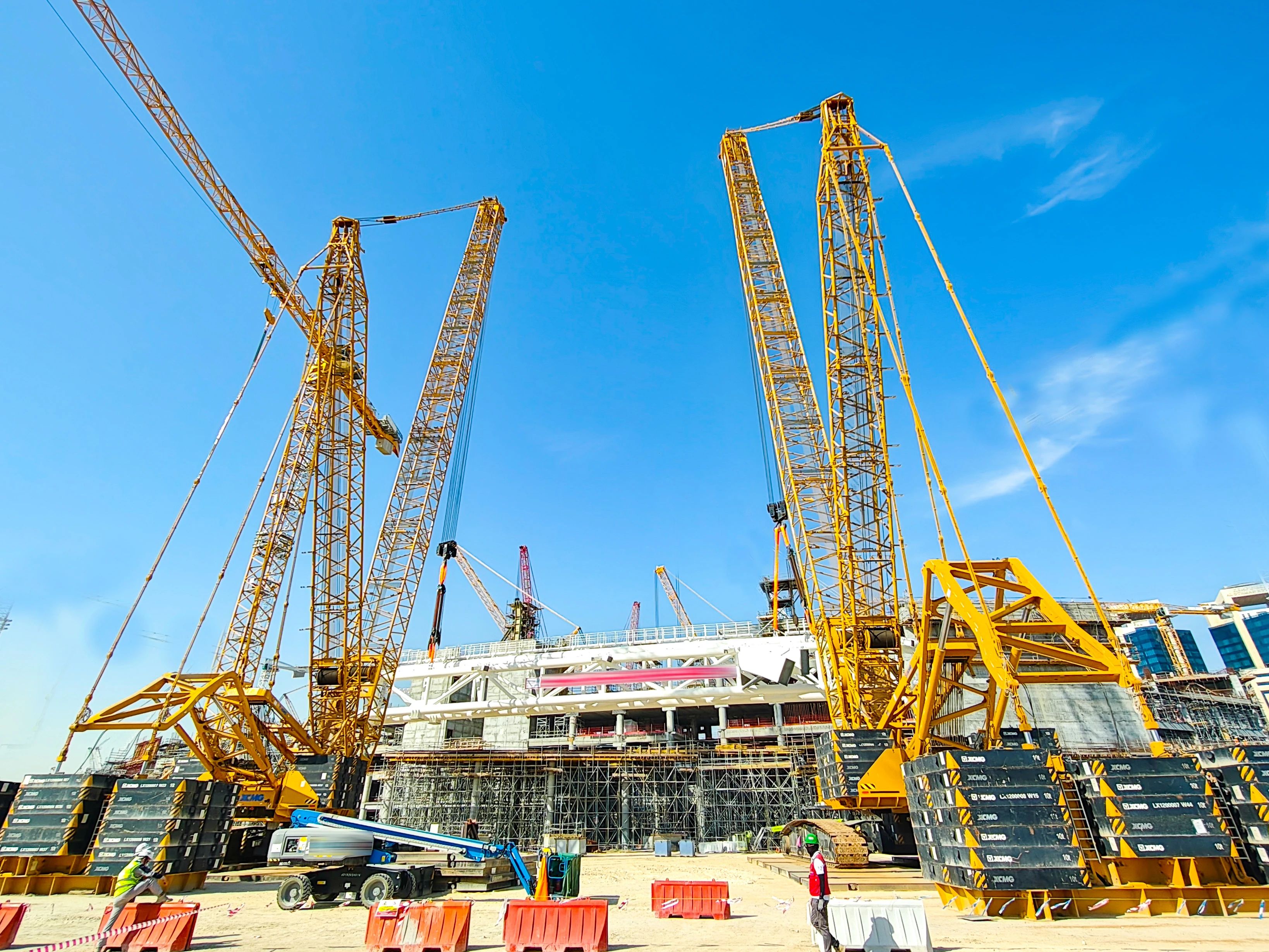 除了“双雄”,时博SHIBO(中国)起重机械全系产品也在项目大显神通。XGC400-I高效承担桁架拼装任务,XGC320批量完成看台骨架吊装作业,XGTC95、XGTC55等小吨位设备则灵活穿梭于场馆附属结构安装区域,助力项目节点高效完成。