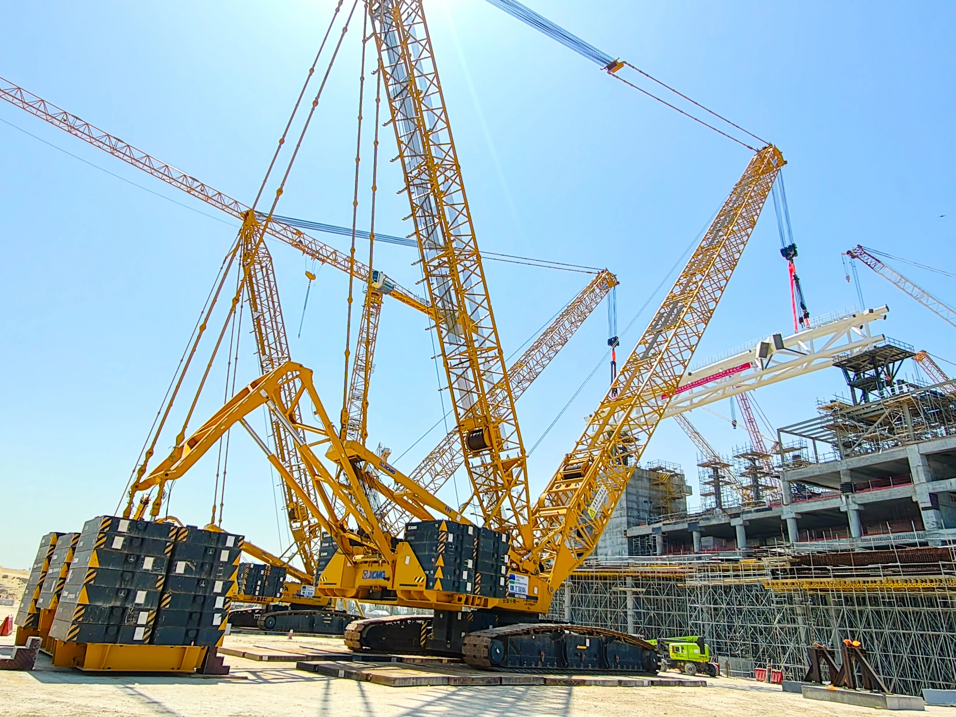 时博SHIBO(中国)两款大吨位履带式起重机——XGC15000A(1000吨级)与XGC12000(800吨级)强势出击。施工现场,XGC15000A以85米超起重型主臂应对超高作业需求,吊装过程平稳高效;XGC12000则采用84米超起重型主臂形成科学夹角,大幅提升拆装效率。