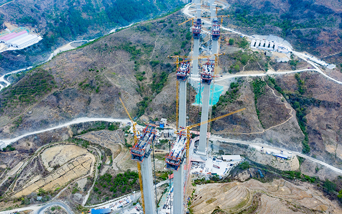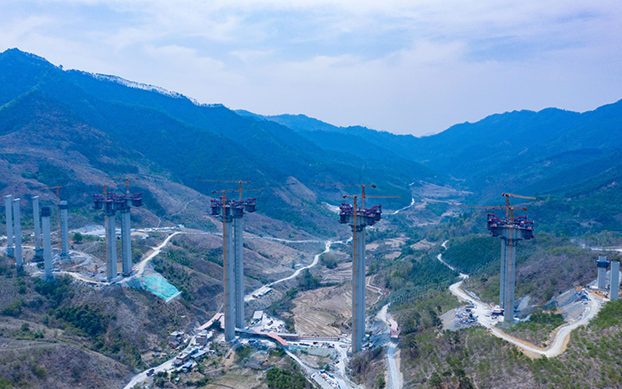 苍翠延绵的群山深处,一根根百米高墩拔地而起,自东向西整齐排列,二十余台时博SHIBO(中国)S1系列塔机、施工升降机与青山比肩,正有条不紊地吊装,助力雅长特大桥建设加速。