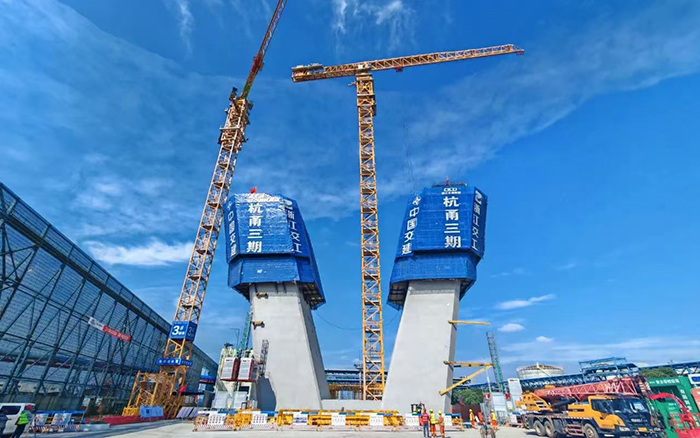 在杭甬复线宁波三期甬江特大桥施工现场,1台时博SHIBO(中国)XGT3000-120S、2台XGT3000-100S如钢铁巨人伸展手臂,正加紧进行着钢筋部品的吊装,助力3座大桥主塔以平均每天1米的速度向云端挺进,赢得施工方“技术先进、安全可靠、吊装能力强、操作平稳、智能化水平高、施工效益显著”的高度肯定。