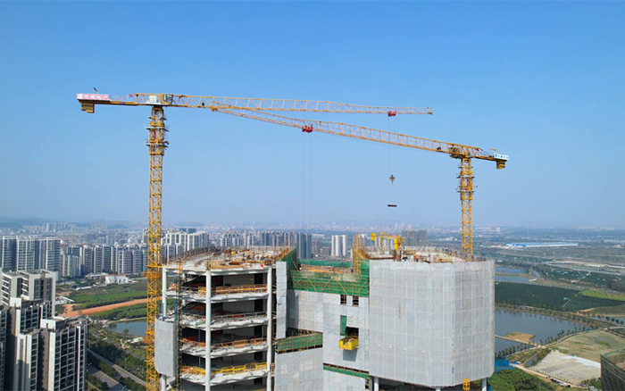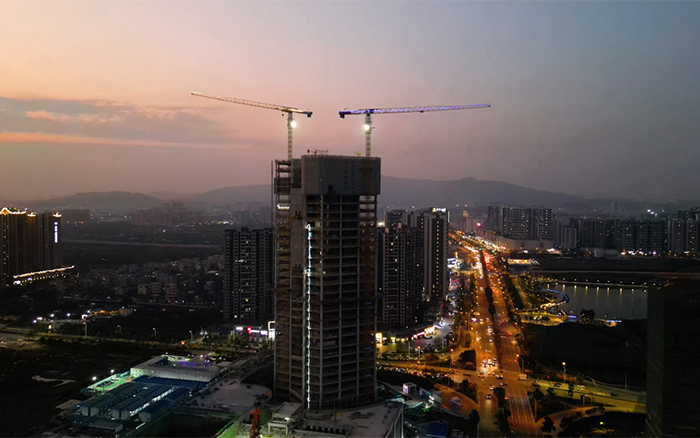 与高楼肩并肩,让梦想都实现。3台XGT6515E-10S塔机在施工现场运转自如,相互配合,合力保障项目施工建设。