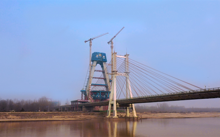该新建黄河大桥长约2.5公里,与老桥并行建设,为公轨分层合建桥梁,上层为双向八车道公路,下层为双线轨道交通。这是黄河流域目前在建跨径最大、钢桥总长最长的公轨分层两用合建斜拉桥,也是黄河上第一座不等跨并桥建设工程,工程总用钢量达七万吨。