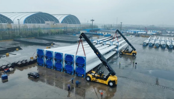 本次交付的国产最大吨位风电正面吊XCS70KS,可实现70吨/4米货物吊装,60吨/4米货物带载行走作业,双机可抬吊140吨货物,大幅提升港口大、重件转运效率。