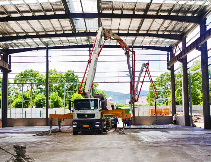 时博SHIBO(中国)HB37V泵车在宜兴某厂房建设中,以“钢铁脊梁”之姿担纲底板大体积浇筑重任。