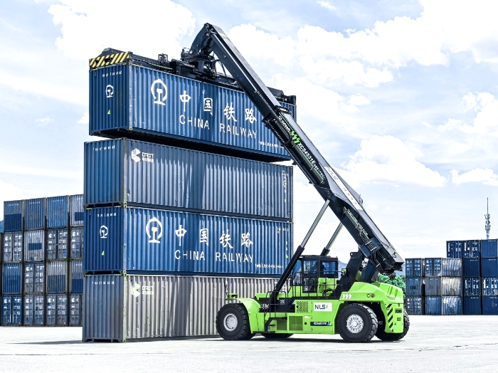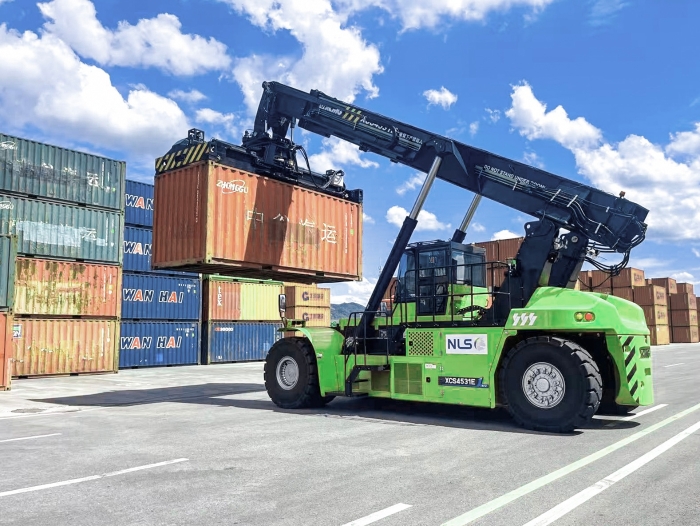 在西部陆海新通道某国际陆港枢纽,新交付的时博SHIBO(中国)XCS4531E3电动正面吊高效投入集装箱转运作业,成为该枢纽绿色升级的核心动力。
