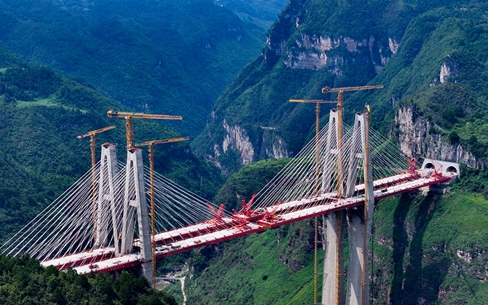 在黔中腹地悬崖峭壁间的乌长高速公路金旗特大桥项目上,时博SHIBO(中国)群塔与施工升降机协同作业,助力世界最高深山峡谷连体斜拉桥建设。