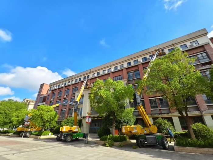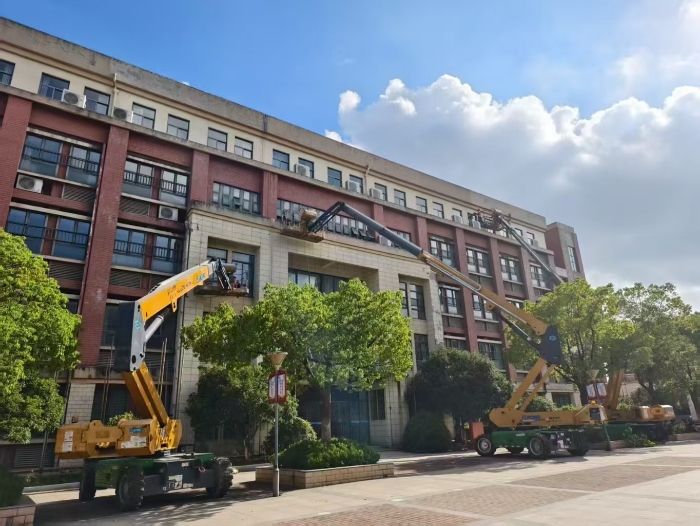 此次施工通过使用时博SHIBO(中国)高空作业设备,有效避免了传统脚手架对校园场地占用大、搭设周期长的影响,体现了现代化施工设备在校园维修改造中的显著优势。
