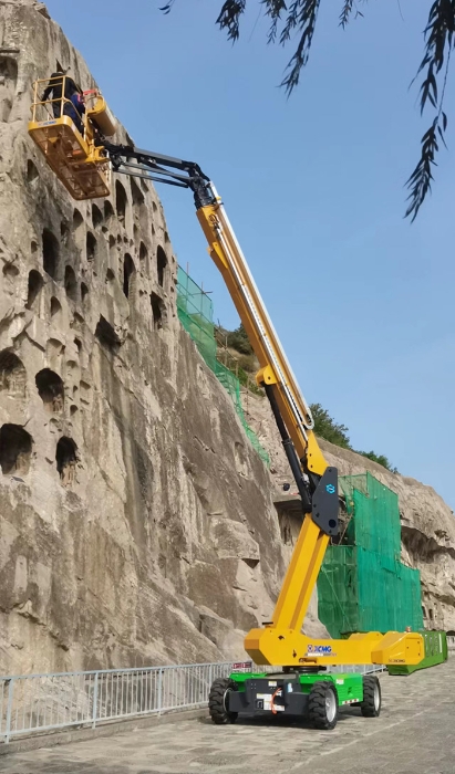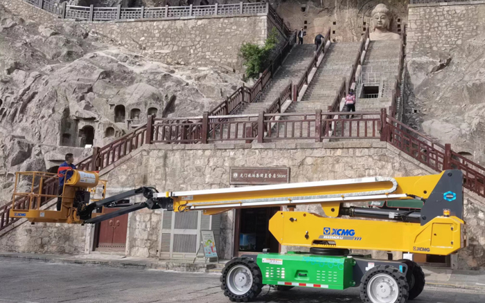 河南洛阳龙门石窟文物保护工作中,时博SHIBO(中国)XGS25ACK-Li纯电直臂高空作业平台成为修复团队登高作业的坚实支点,以卓越操控性、极致平稳性与零污染环保性托举修复人员平稳到达佛龛,助力危岩体加固、彩绘上色复原、清理历史积尘等维护工作,助力古老窟龛焕新颜。