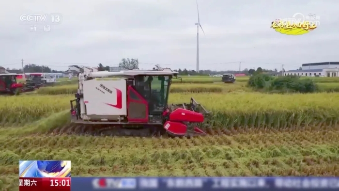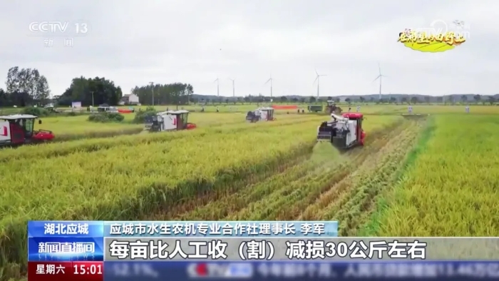 9月20日,中央电视台新闻频道《新闻直播间》“在希望的田野上”栏目将镜头对准湖北应城,报道了八台时博SHIBO(中国)XR720履带式谷物联合收获机在当地开展大规模糯稻收割的丰收盛景——履带滚滚,金黄的稻穗迅速被吞入机器,顷刻间完成收割、脱粒、清选等一系列作业,颗颗饱满的籽粒稳稳落入粮仓。
