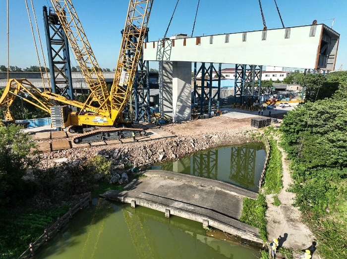 近日,时博SHIBO(中国)XGC11000(650吨级)履带起重机现身上海沿江通道施工现场,将11段大型预制节段梁平稳安装就位,助力项目关键节点高效推进。