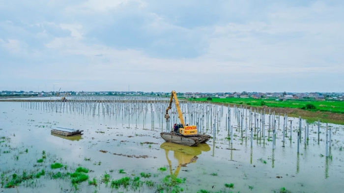 在渔业较为发达的滨海港镇,“渔光互补”光伏发电项目建设正如火如荼,项目现场,时博SHIBO(中国)水上打桩机的身影随处可见。